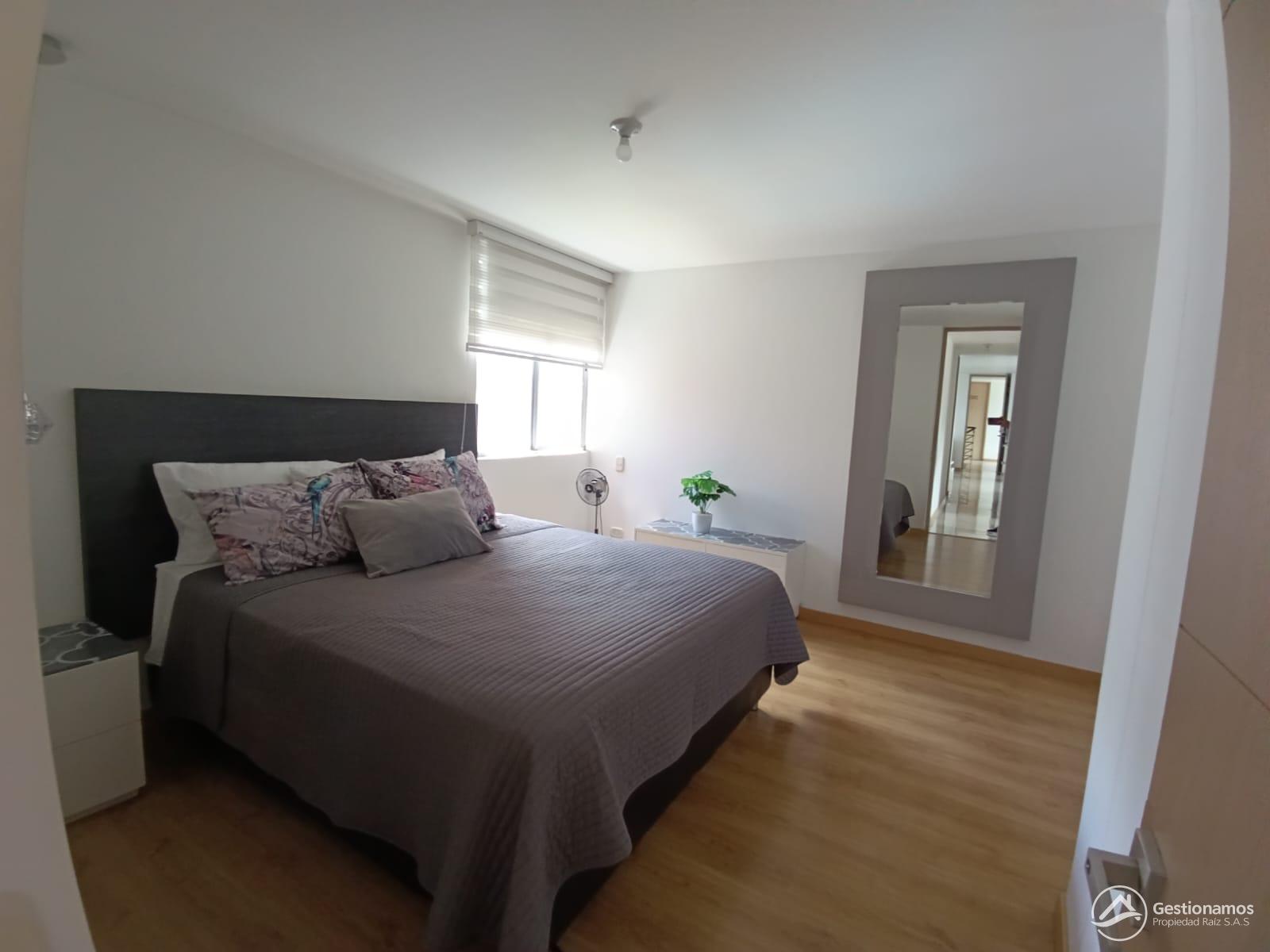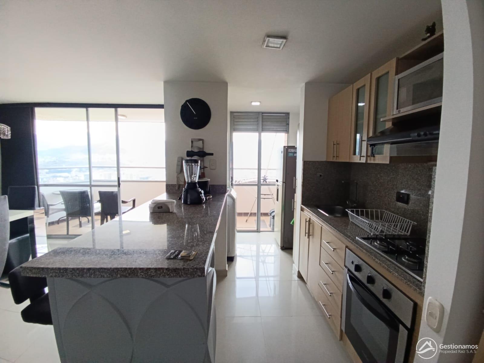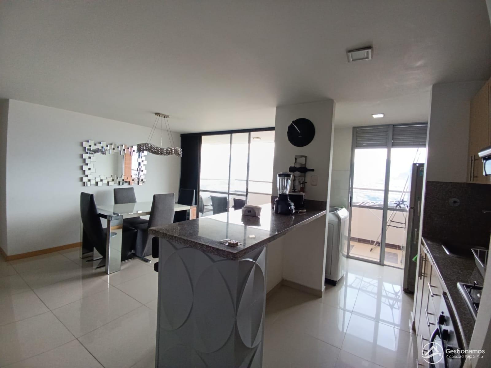 Apartamento de 98 m2, amoblado, 3 alcobas, sala comedor, cocina integral, 2 baños cabinados, 2 closets, 1 vestier, piso en cerámica, zona de ropa, parqueadero cubierto, excelentes acabados e iluminación.