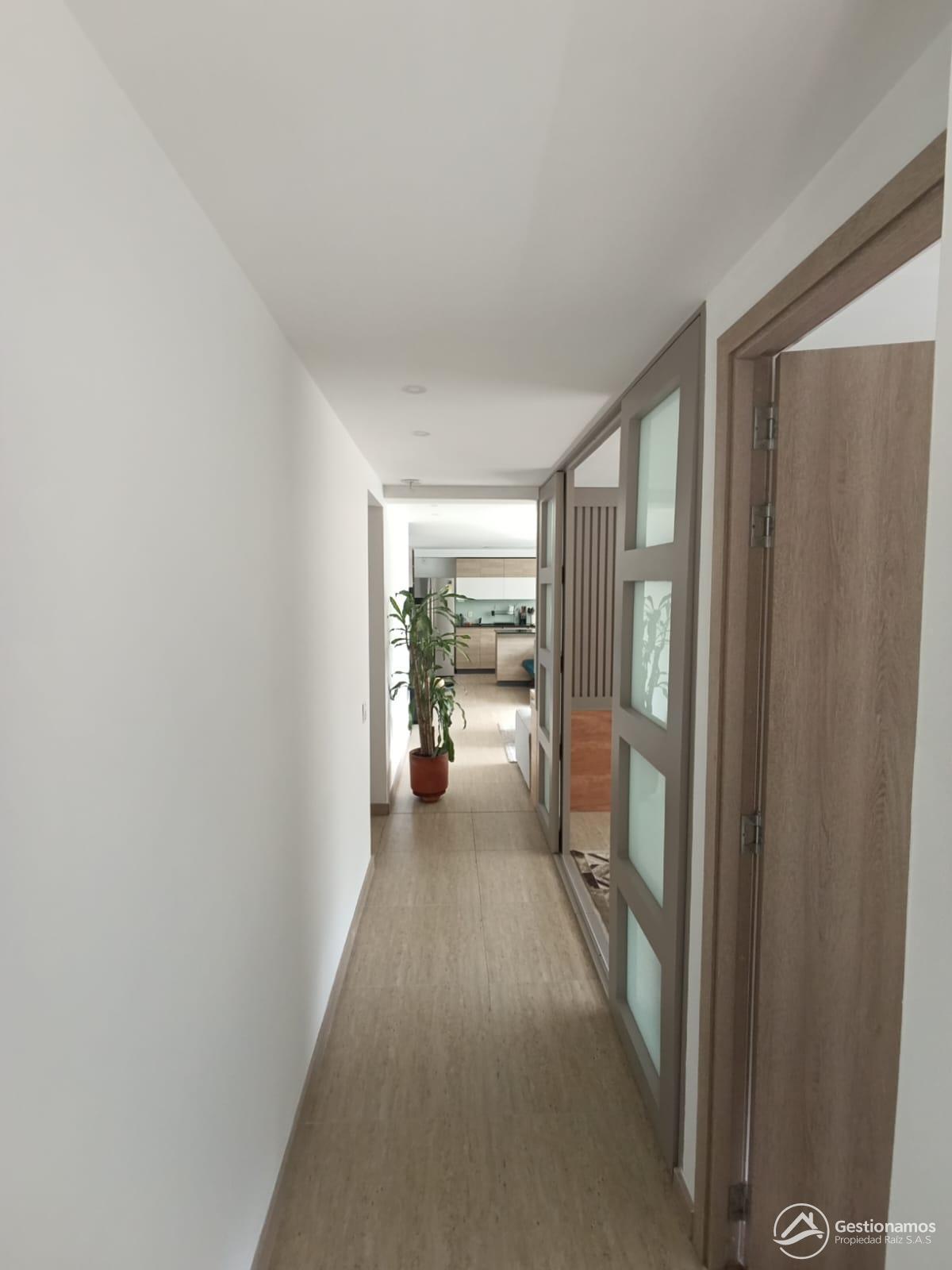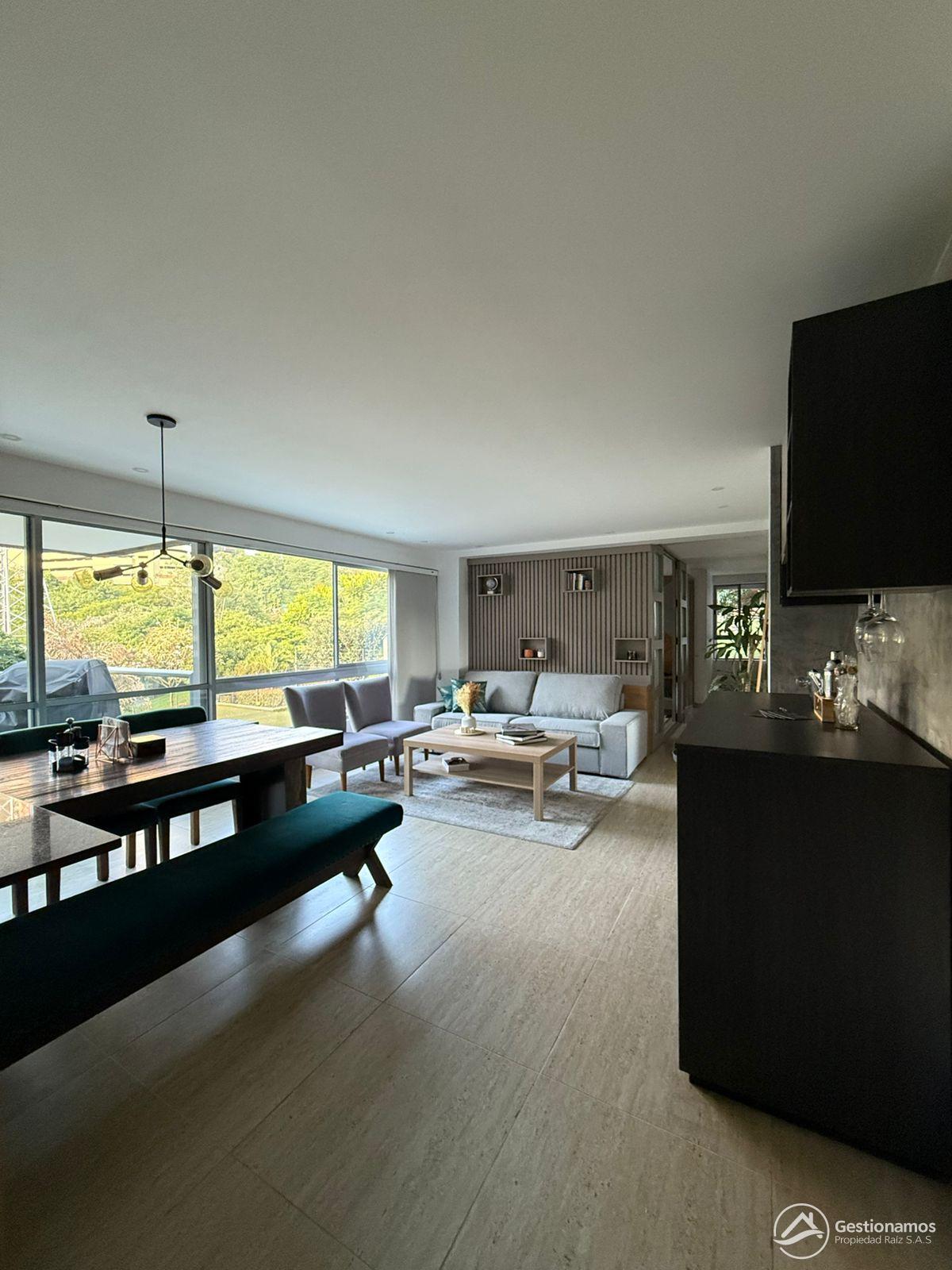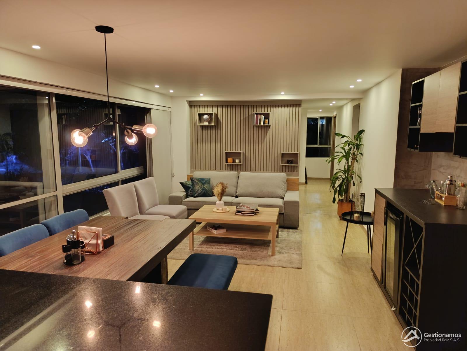 Apartamento de 93 m2, amoblado, 2 alcobas, sala comedor, cocina integral, 2 baño, 2 closets, 1 vestier, piso en cerámica, zona de ropa, parqueadero doble lineal, cuarto útil, excelentes acabados e iluminación.