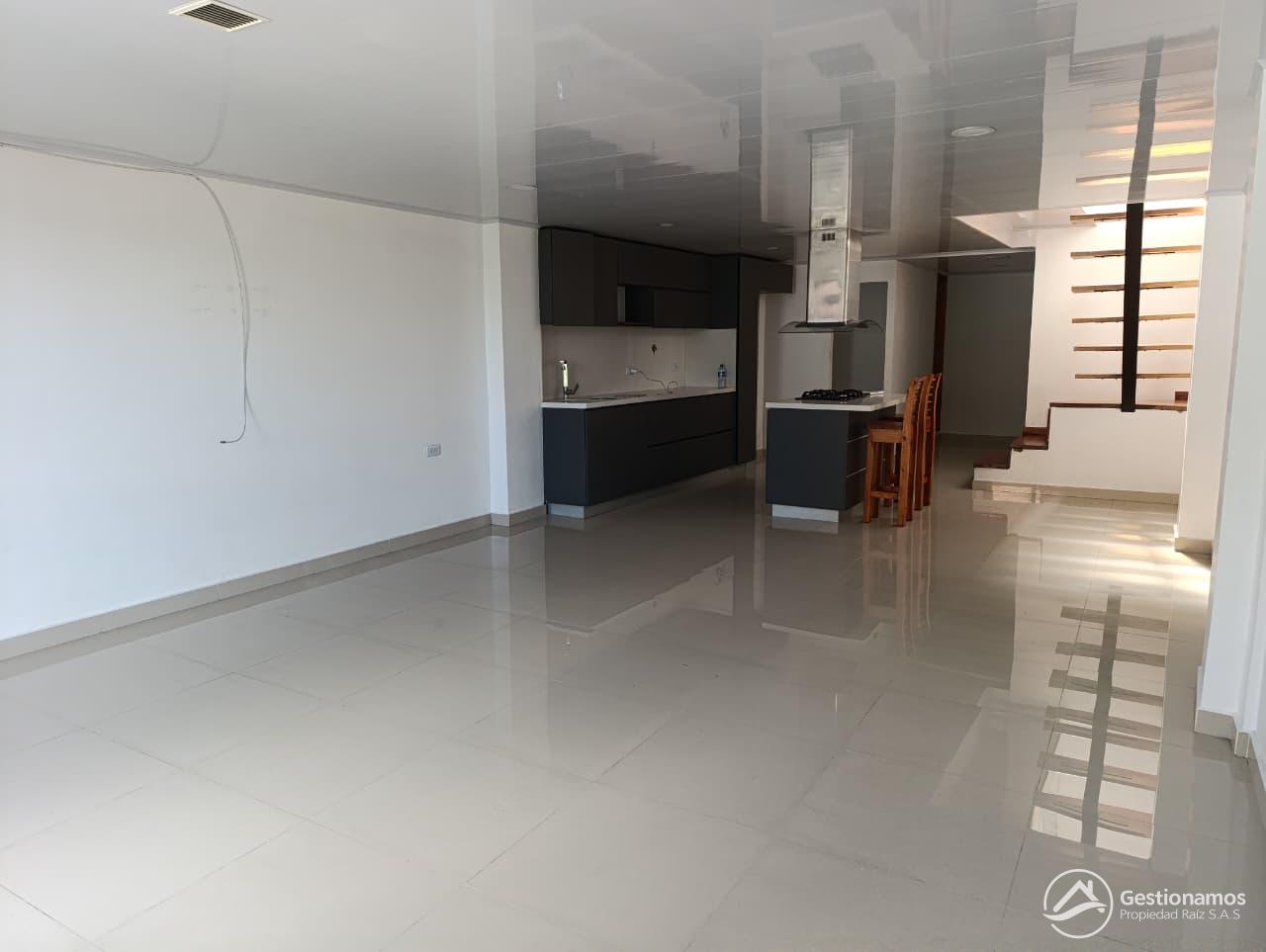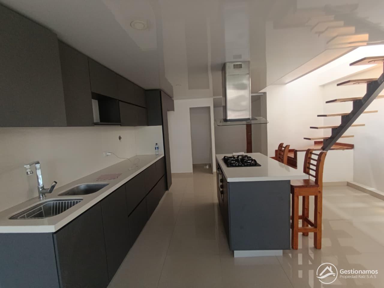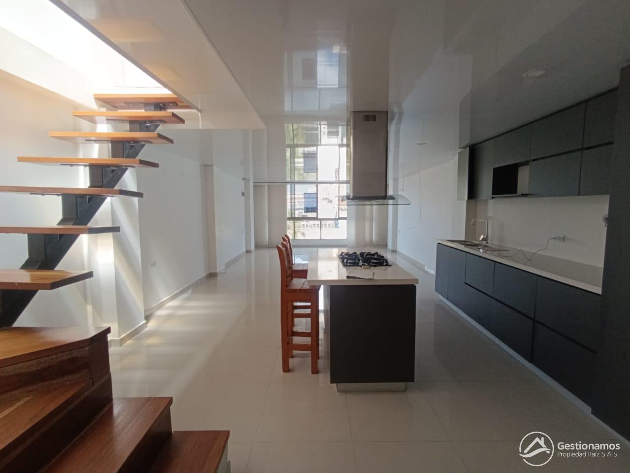 Apartamento de 100 m2, duplex, 3 alcobas, sala comedor, cocina integral, 2 baños, 1 closets, 1 vestir, piso en porcelanato, zona de ropa, excelentes acabados e iluminación.
